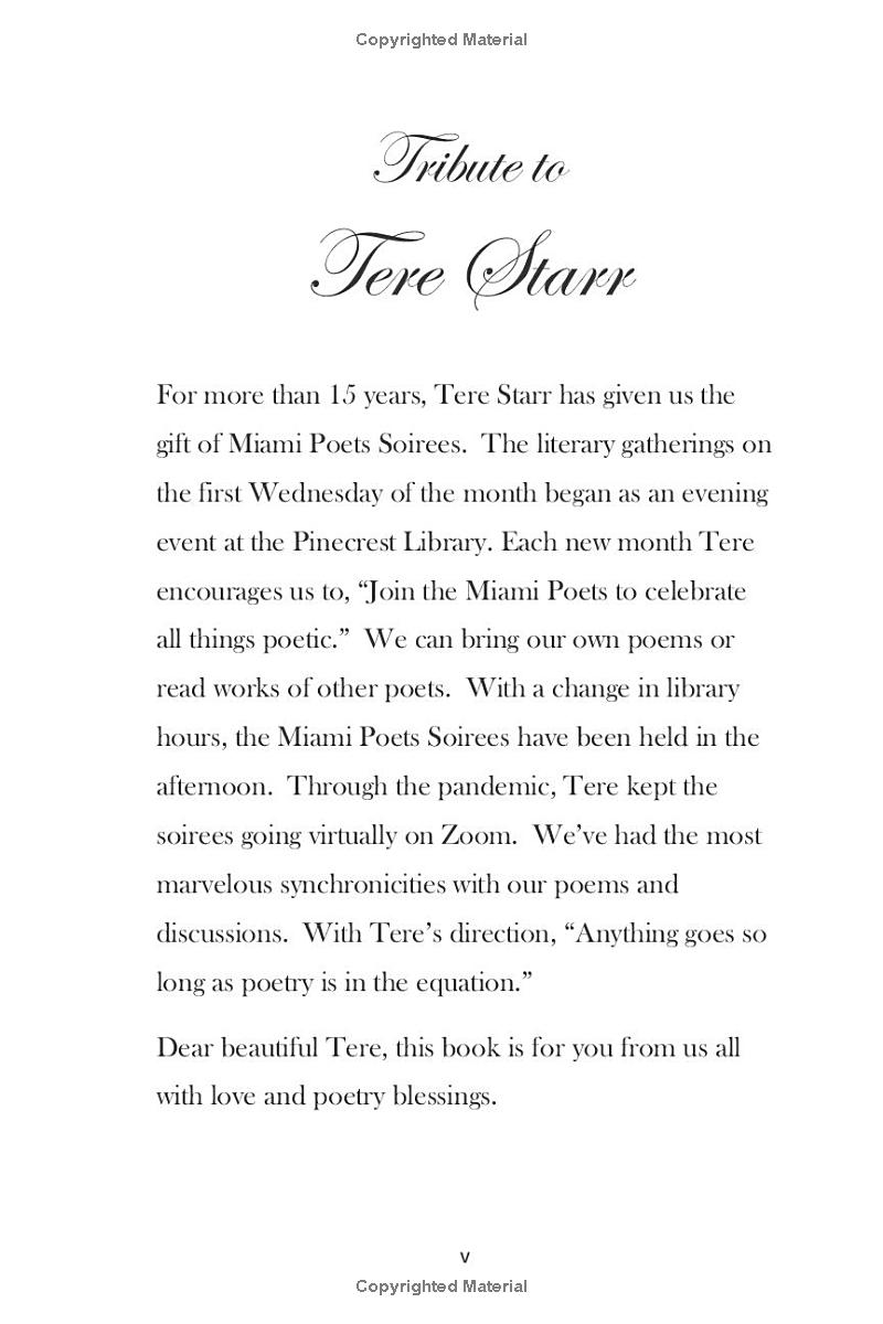 For more than 15 years, Tere Starr has given us the gift of Miami Poets Soirees. The literary gatherings on the first Wednesday of the month began as an evening event at the Pinecrest Library. Each new month Tere encourages us to 'Join the Miami Poets to celebrate all things poetic.' We can bring our own poems or read works of other poets. This anthology celebrates the community of poets who have shared their work, their passion, and their love of poetry through this beloved gathering.
